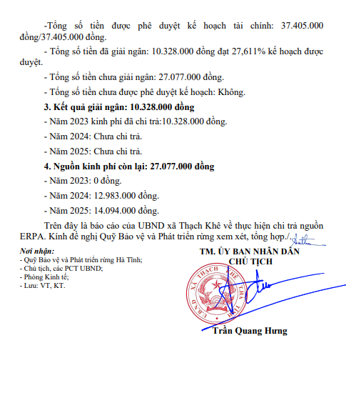 Báo cáo về việc giải ngân nguồn vốn Quỹ ERPA năm 2023,2024,2025 (Kính nhờ gửi giúp Quỹ bảo vệ và PT rừng Hà Tĩnh) UBND xã Thạch Khê09/10/2025A -A+UBND xã Thạch Khê09/10/2025A -A+