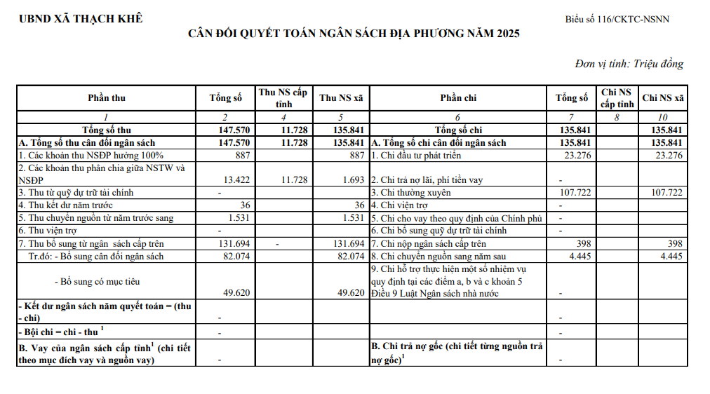 Tính đến hết kỳ quyết toán năm 2025, tình hình tài chính của xã Thạch Khê ghi nhận: