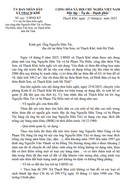 Ngày 14 tháng 8 năm 2025, UBND xã Thạch Khê nhận được nội dung phản ánh của ông Nguyễn Hữu Tài và bà Phạm Thị Hiền, công dân thôn Văn Sơn, xã Thạch Khê, kiến nghị với nội dung “Gia đình có thửa đất trồng hoa màu của ông nội trước đây để lại cho con cháu sử dụng trồng cây lâu năm từ năm 2006 đến nay không bị tranh chấp, vị trí thửa đất tại thửa đất số 63, tờ bản đồ số 18, diện tích 349,2 m2 , địa chỉ thửa đất tại thôn Bình Sơn, xã Đỉnh Bàn cũ nay là thôn Bình Sơn, xã Thạch Khê, tỉnh Hà Tĩnh”.