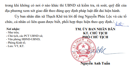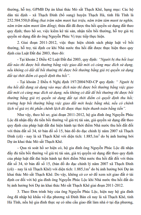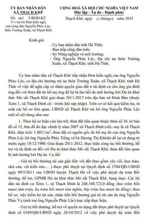 Ủy ban nhân dân xã Thạch Khê tiếp nhận Đơn kiến nghị của ông Nguyễn Phúc Lộc, có địa chỉ thường trú tại thôn Trường Xuân, xã Thạch Khê, tỉnh Hà Tĩnh về việc đề nghị cấp có thẩm quyền giao đất ở tái định cư cho ông gia đình ông đối với thửa đất do bố mẹ ông để lại bị thu hồi do ảnh hưởng bởi Dự án khai thác Mỏ sắt Thạch Khê giai đoạn 2011-2012 trên địa bàn xã Đỉnh Bàn (thuộc Xóm 1, xã Thạch Đỉnh cũ - trước khi sáp nhập)