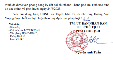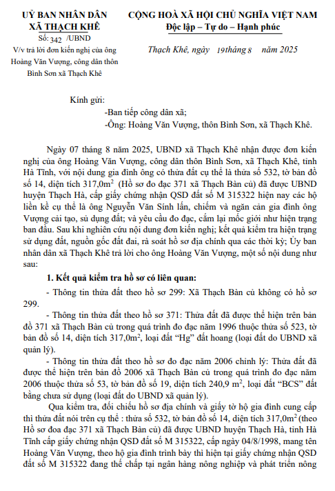 Ngày 07 tháng 8 năm 2025, UBND xã Thạch Khê nhận được đơn kiến nghị của ông Hoàng Văn Vượng, công dân thôn Bình Sơn, xã Thạch Khê, tỉnh Hà Tĩnh, với nội dung gia đình ông có thửa đất cụ thể là thửa số 532, tờ bản đồ số 14, diện tích 317,0m2 (Hồ sơ đo đạc 371 xã Thạch Bàn củ) đã được UBND huyện Thạch Hà, cấp giấy chứng nhận QSD đất số M 315322 hiện nay các hộ liền kề cụ thể là ông Nguyễn Văn Sính lấn, chiếm và ngăn cản gia đình ông Vượng cải tạo, sủ dụng đất; và yêu cầu đo đạc, cắm lại mốc giới như hiện trạng ban đầu. Sau khi nghiên cứu nội dung đơn kiến nghị; kết quả kiểm tra hiện trạng sử dụng đất, nguồn gốc đất đai, rà soát hồ sơ địa chính qua các thời kỳ